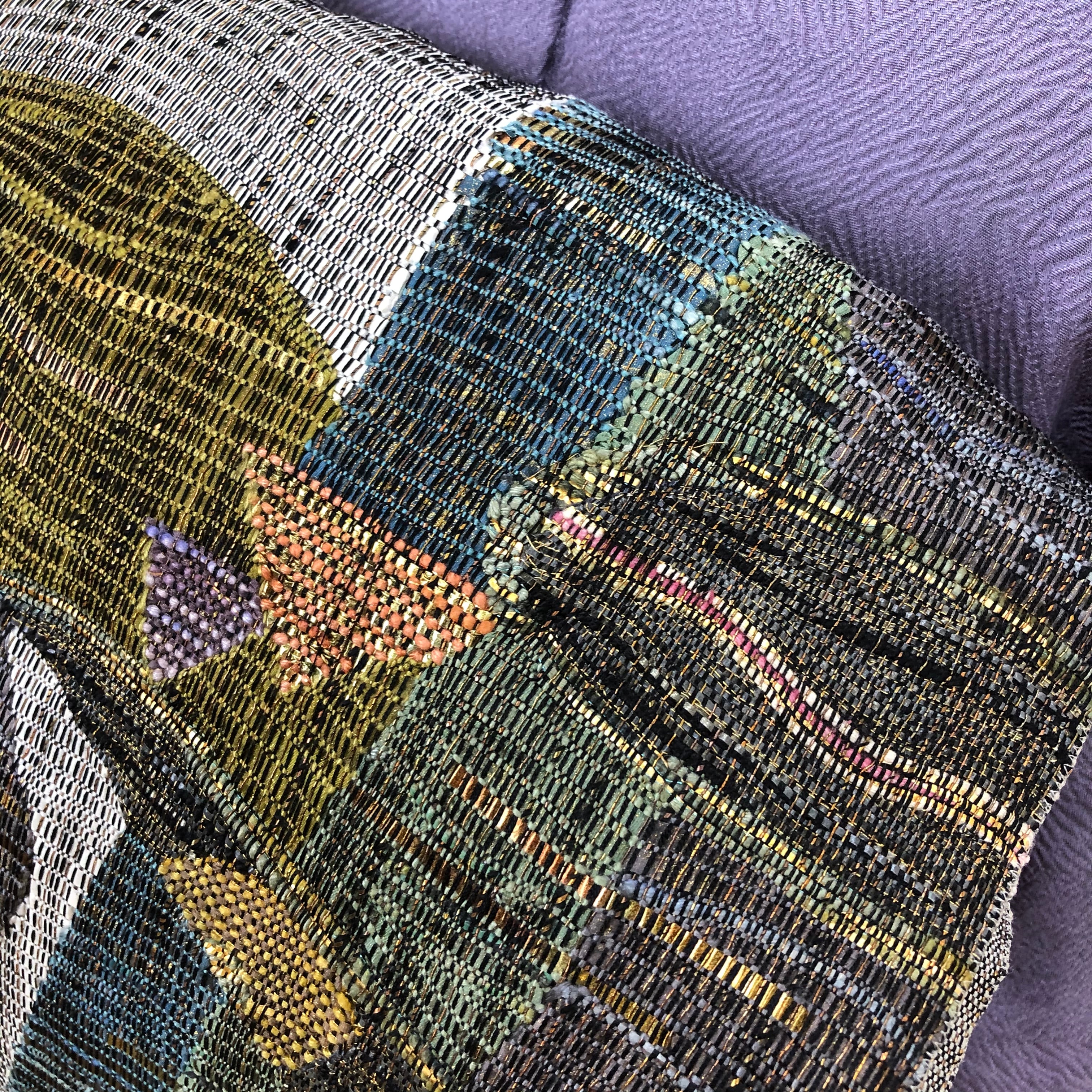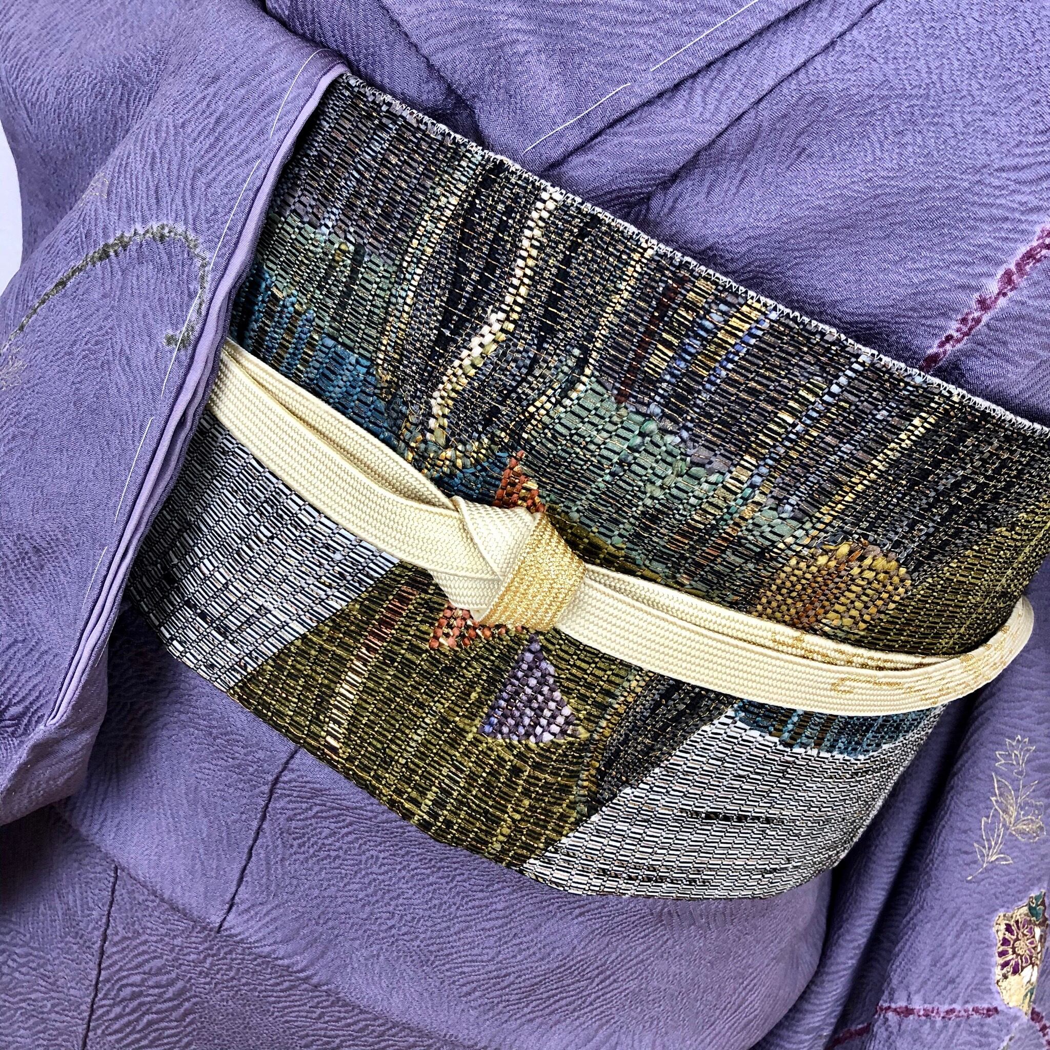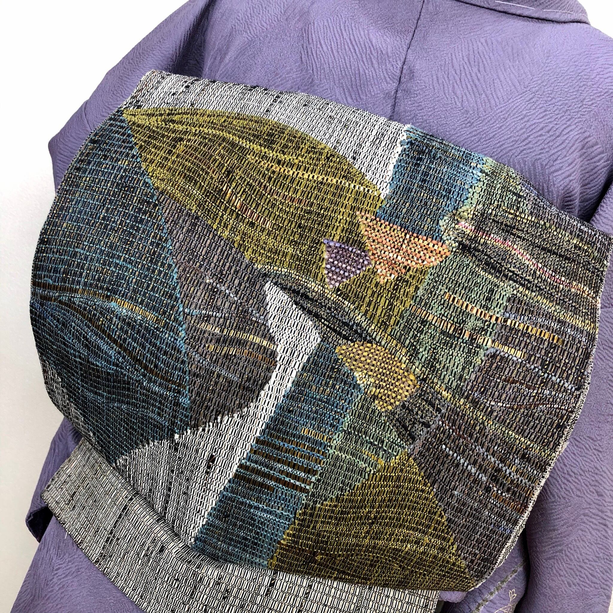 シルクのリボンや和紙を織り込んだ大変美しい洒落袋帯です。