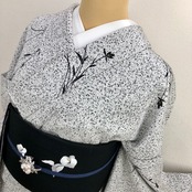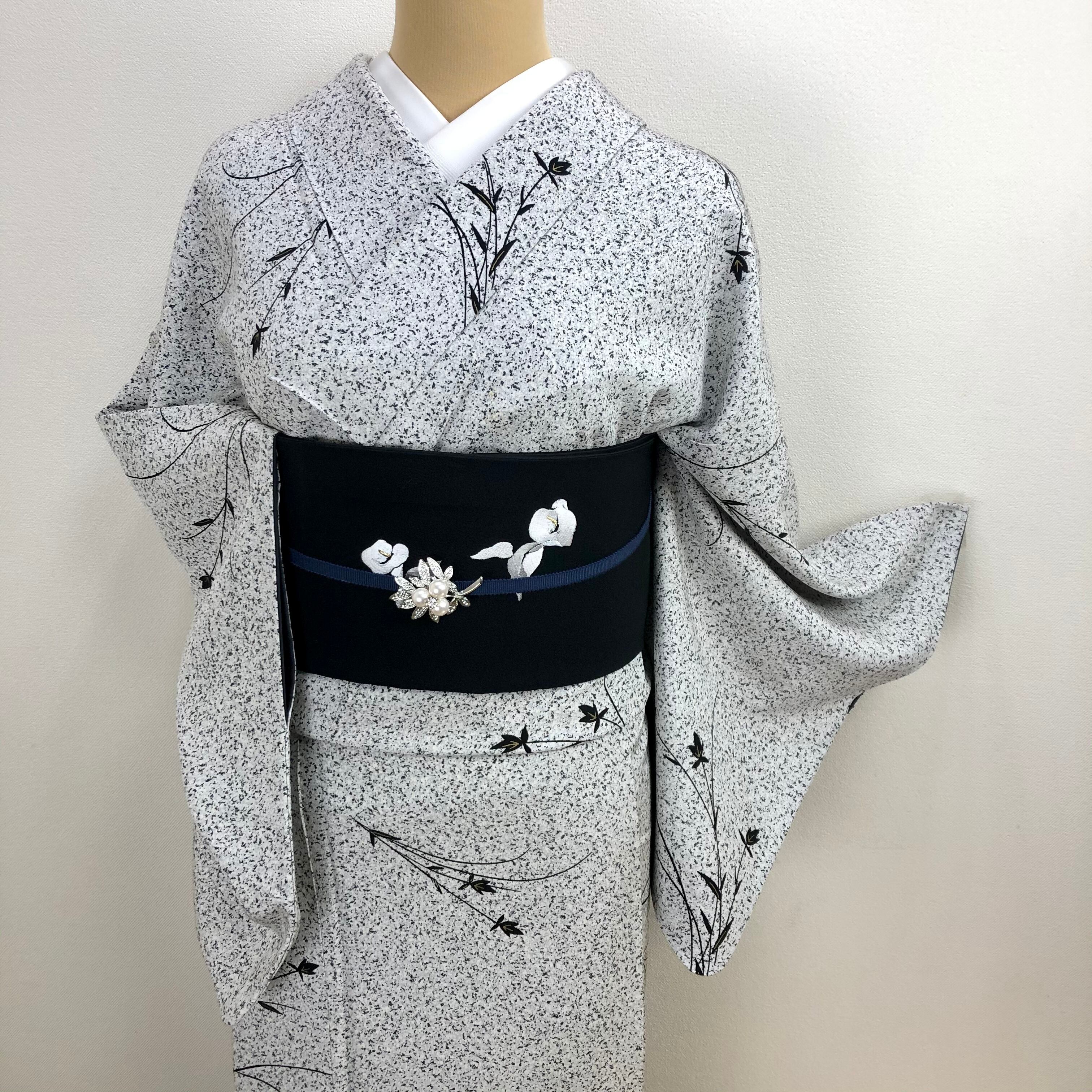 タタキ染めに黒のお花があしらわれたモノトーンの綺麗なお着物です。