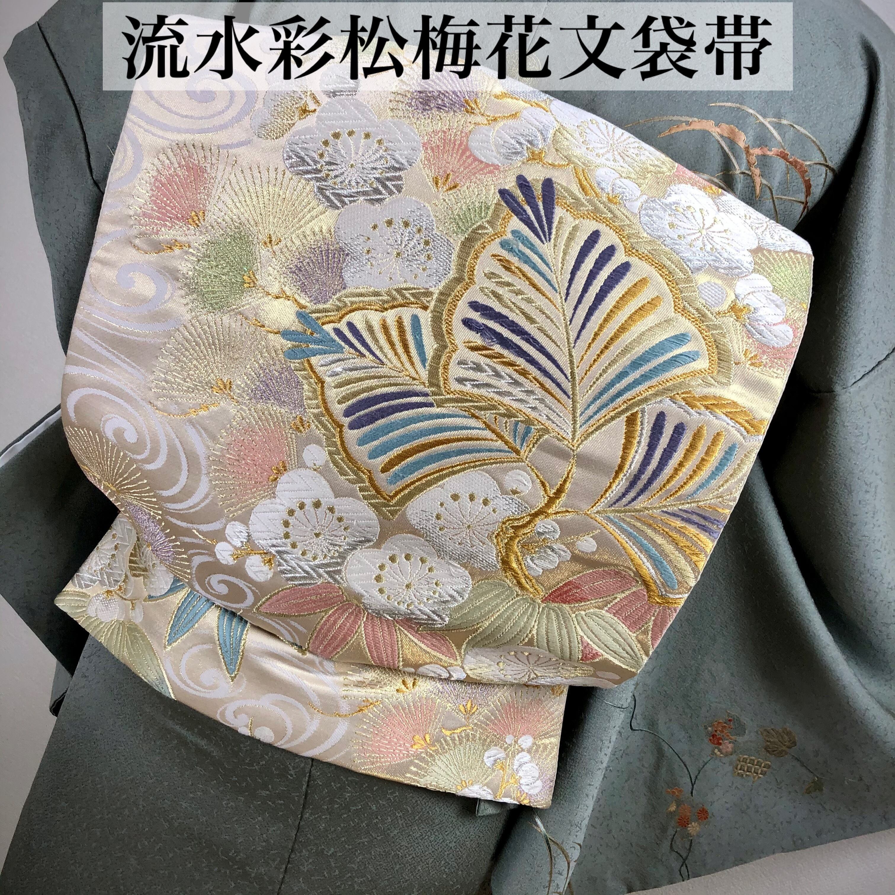 正絹【流水彩松梅花文】西陣織 袋帯q918