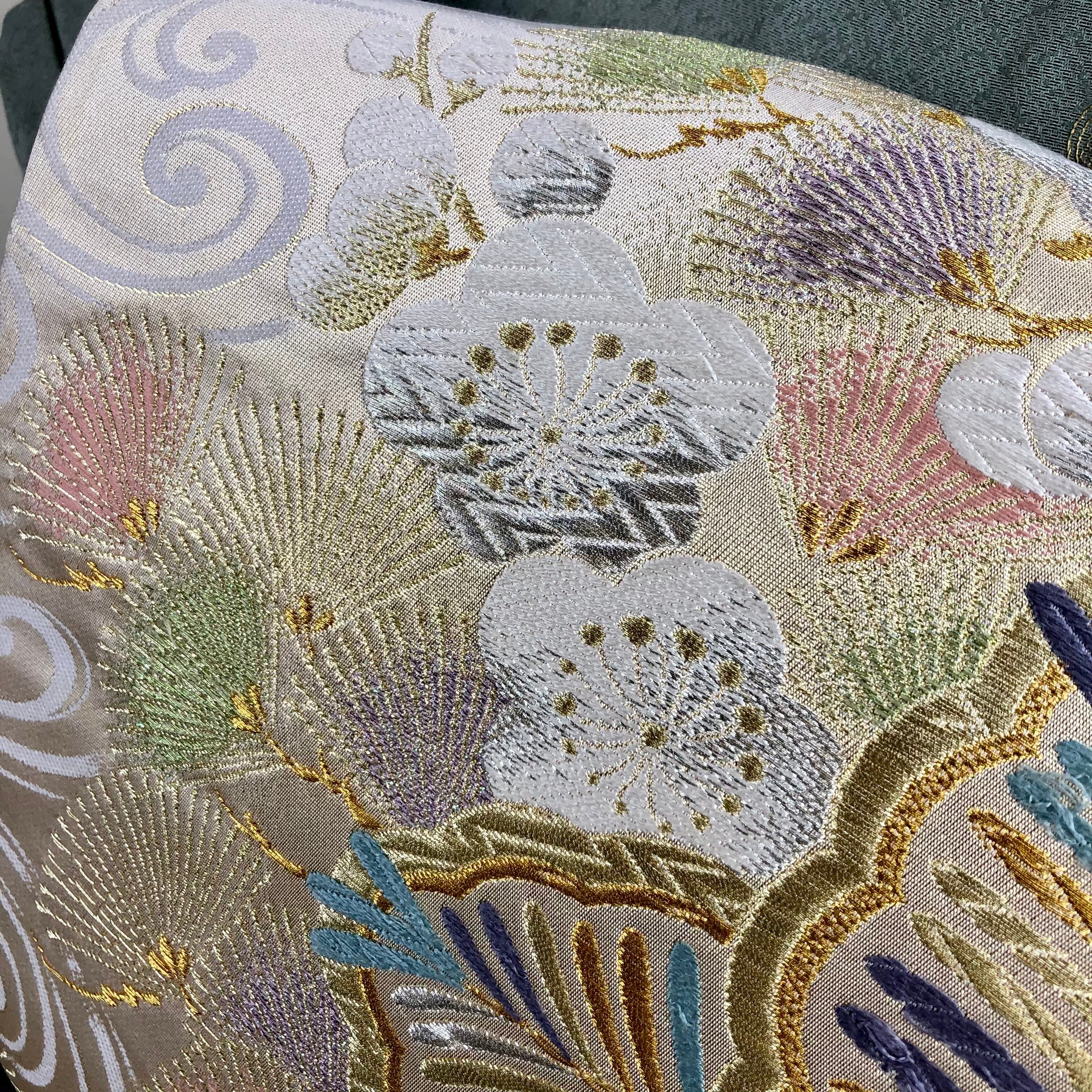 淡いゴールド地様々なお色味の糸を使用し流水彩松梅花文が織り上げられた美しいく上品な袋帯です。