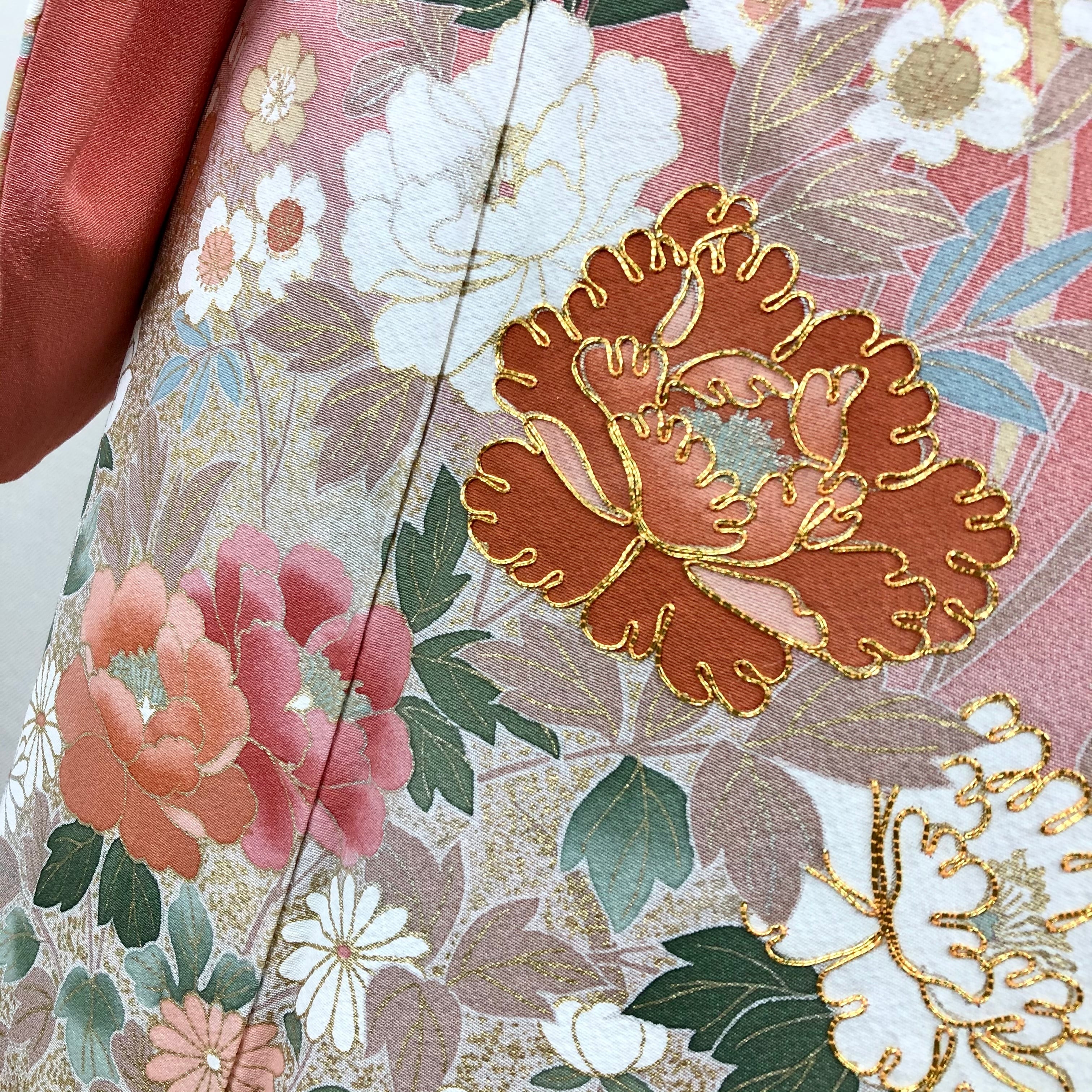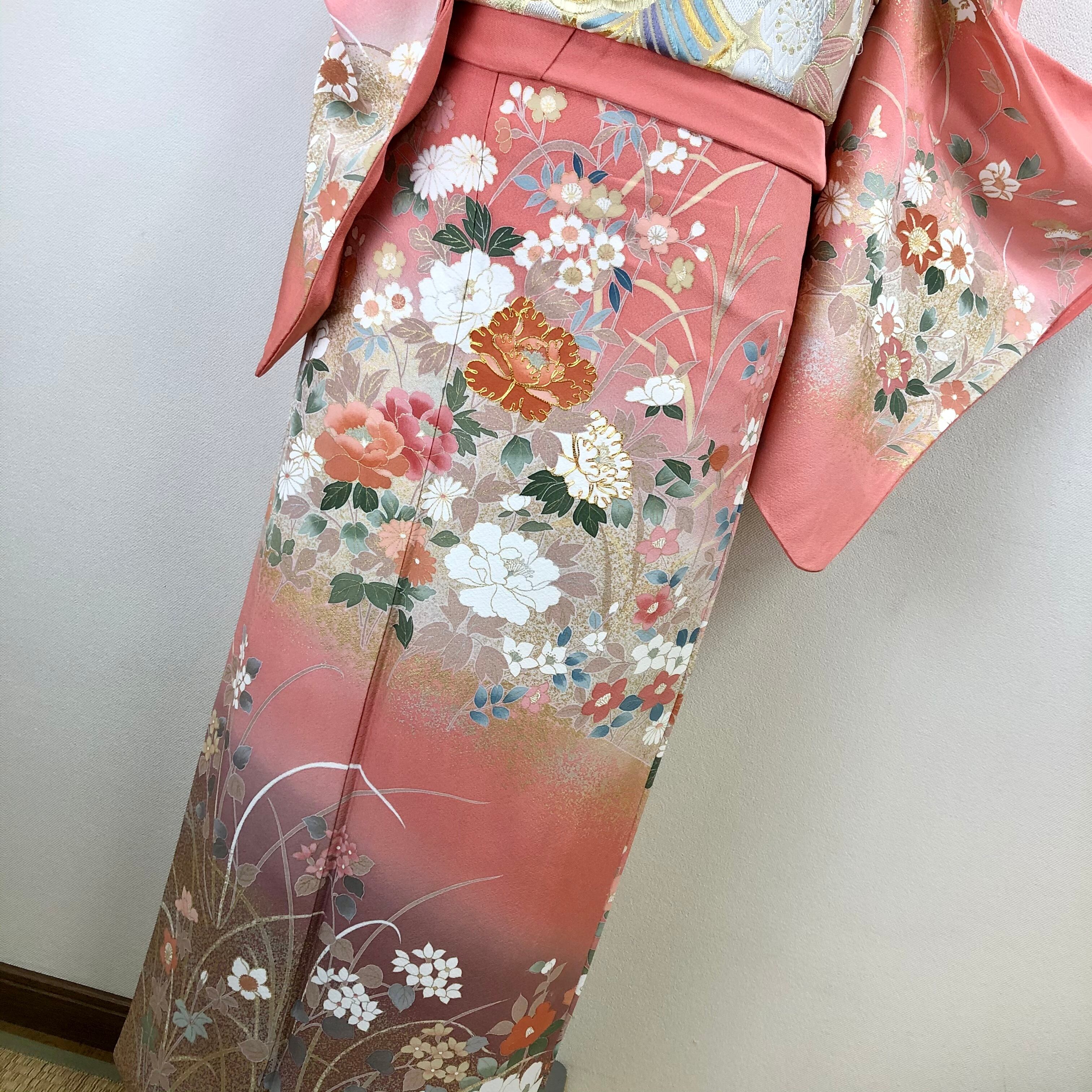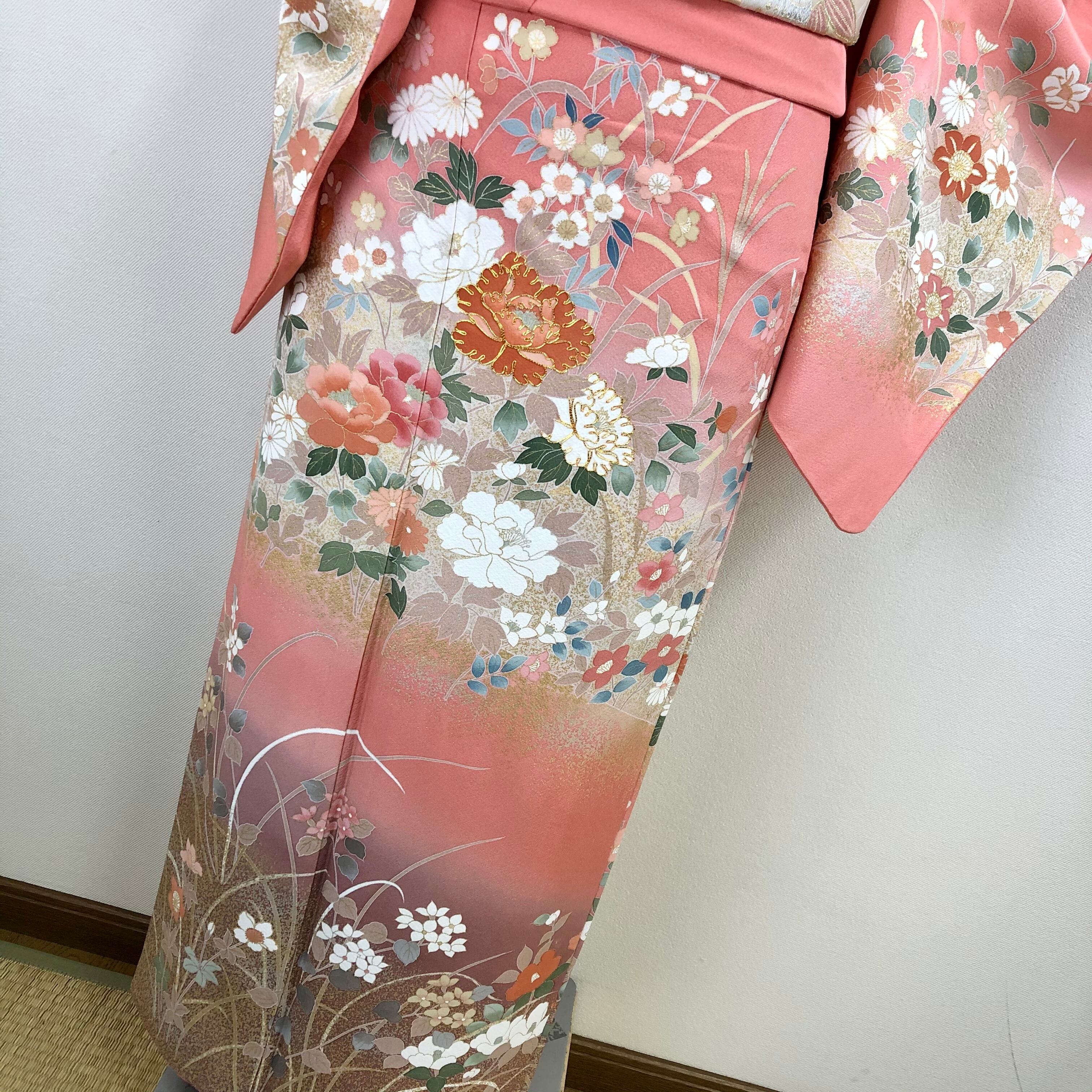 薄紅色系のお色に四季の花々が描かれ上前には金駒刺繍