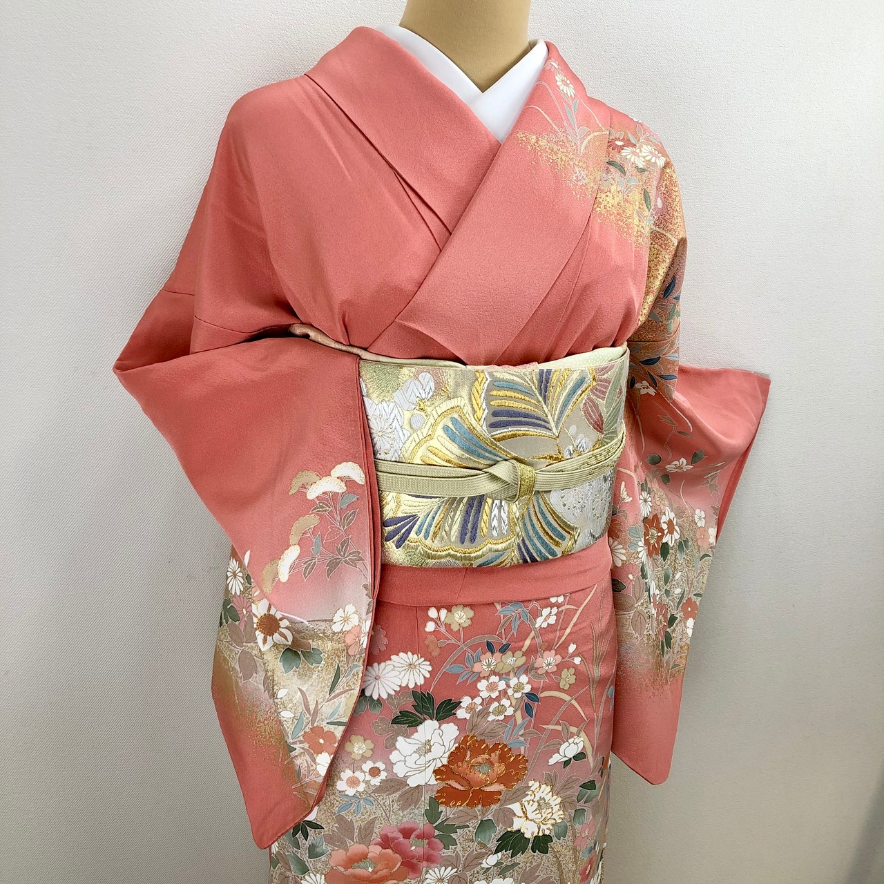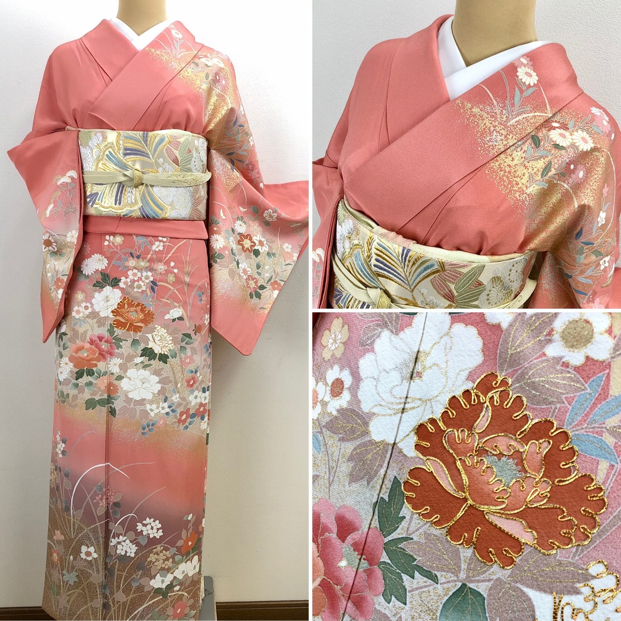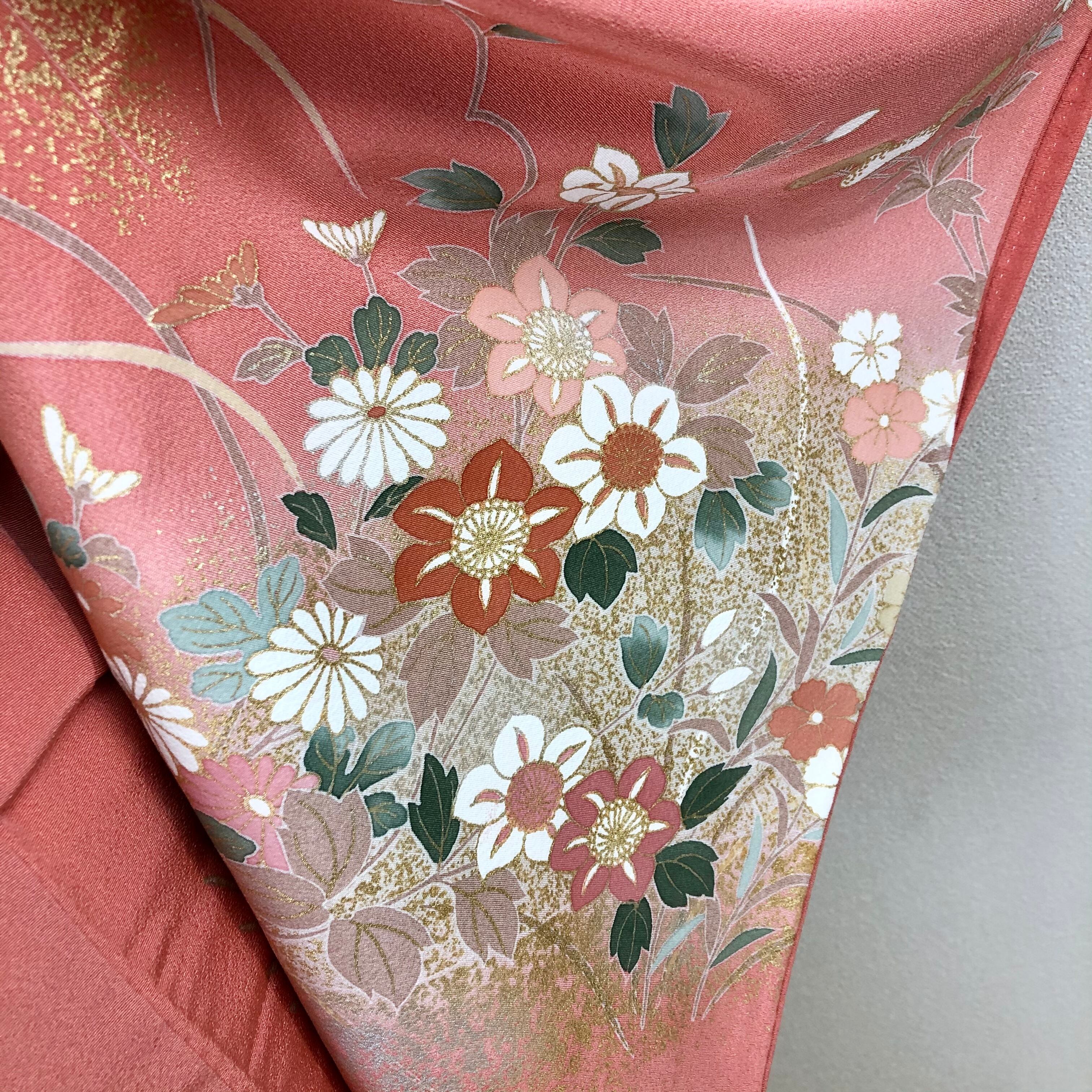 薄紅色系のお色に四季の花々が描かれ上前には金駒刺繍
