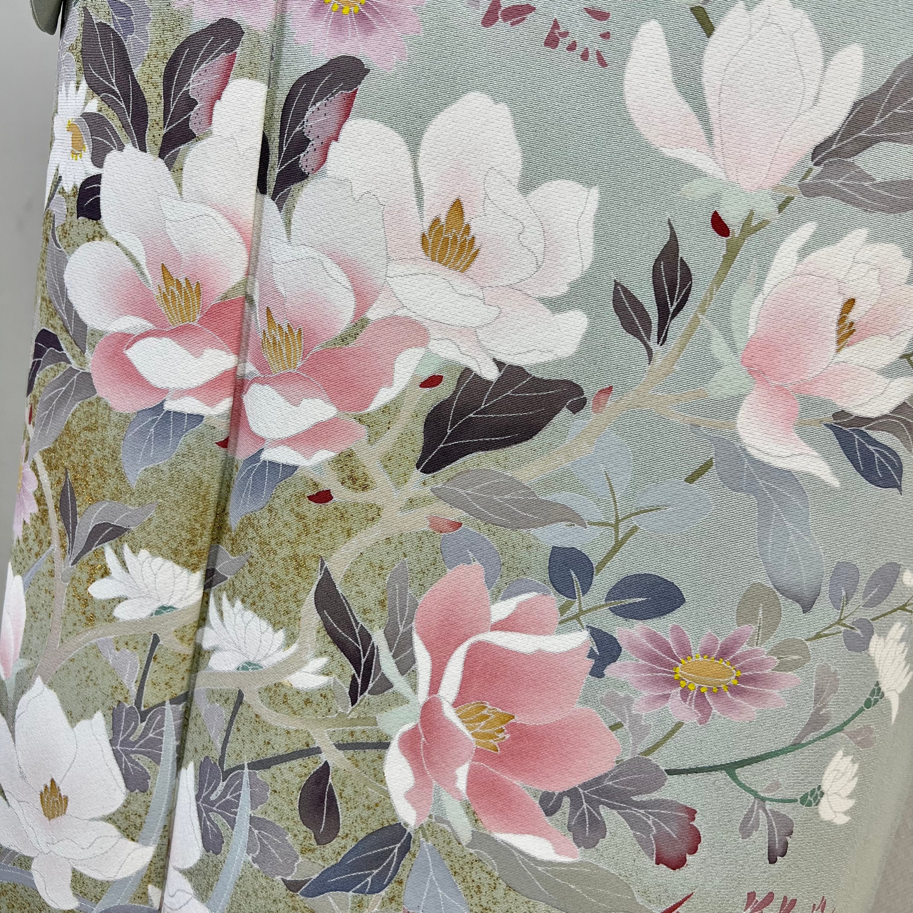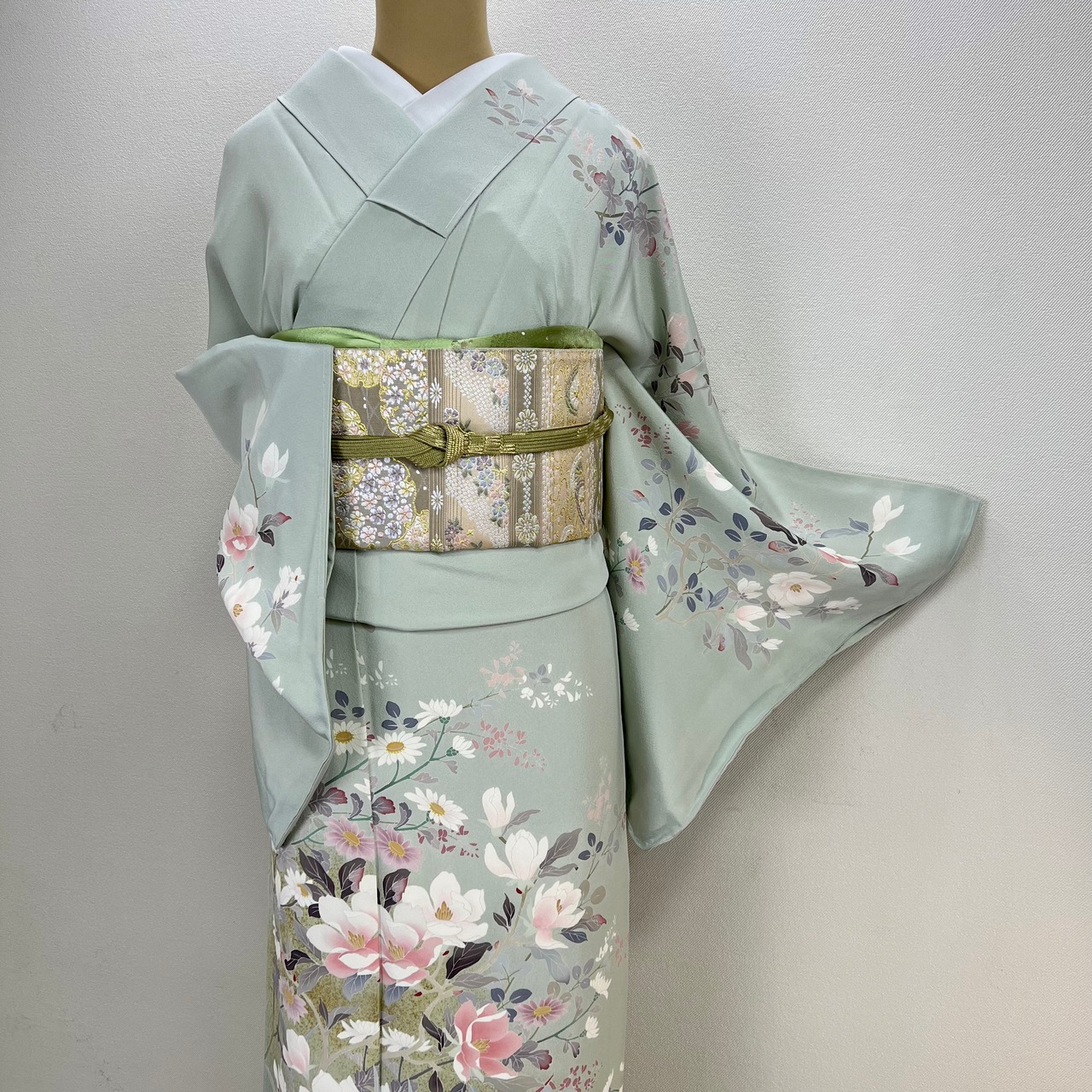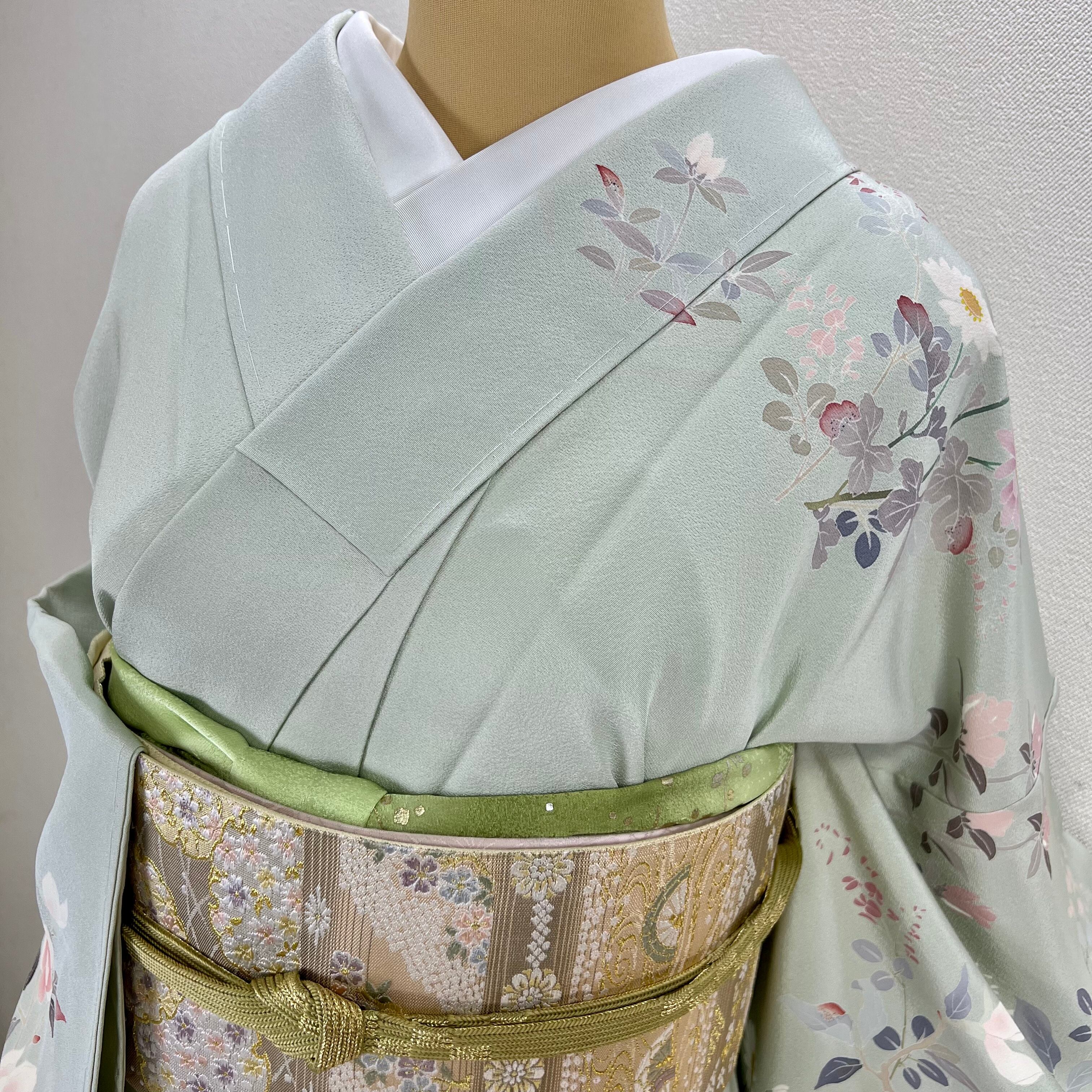 ◆淡いミントグリーンに四季の花々が丁寧に描かれ金彩があしらわれた京友禅美しい訪問着です。
