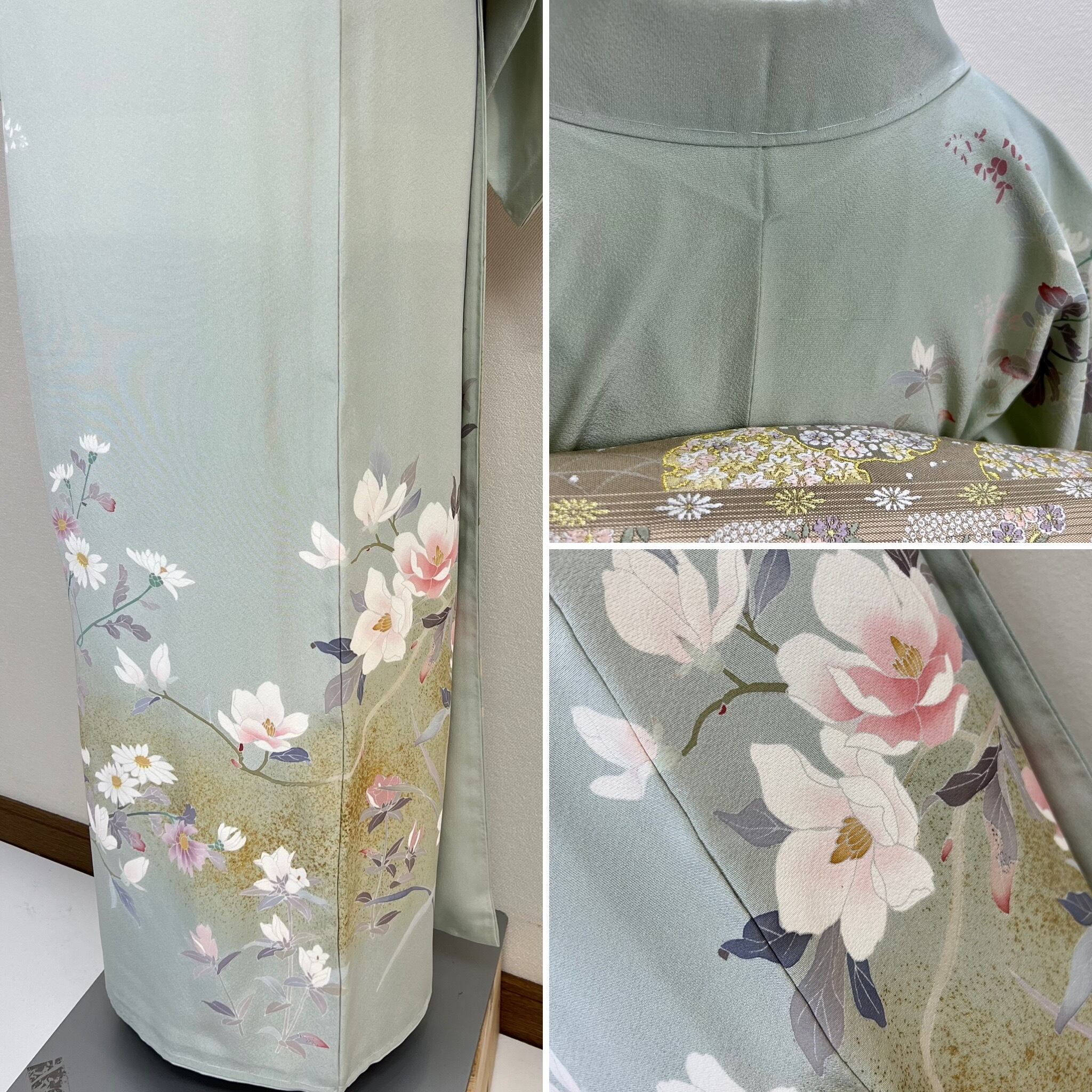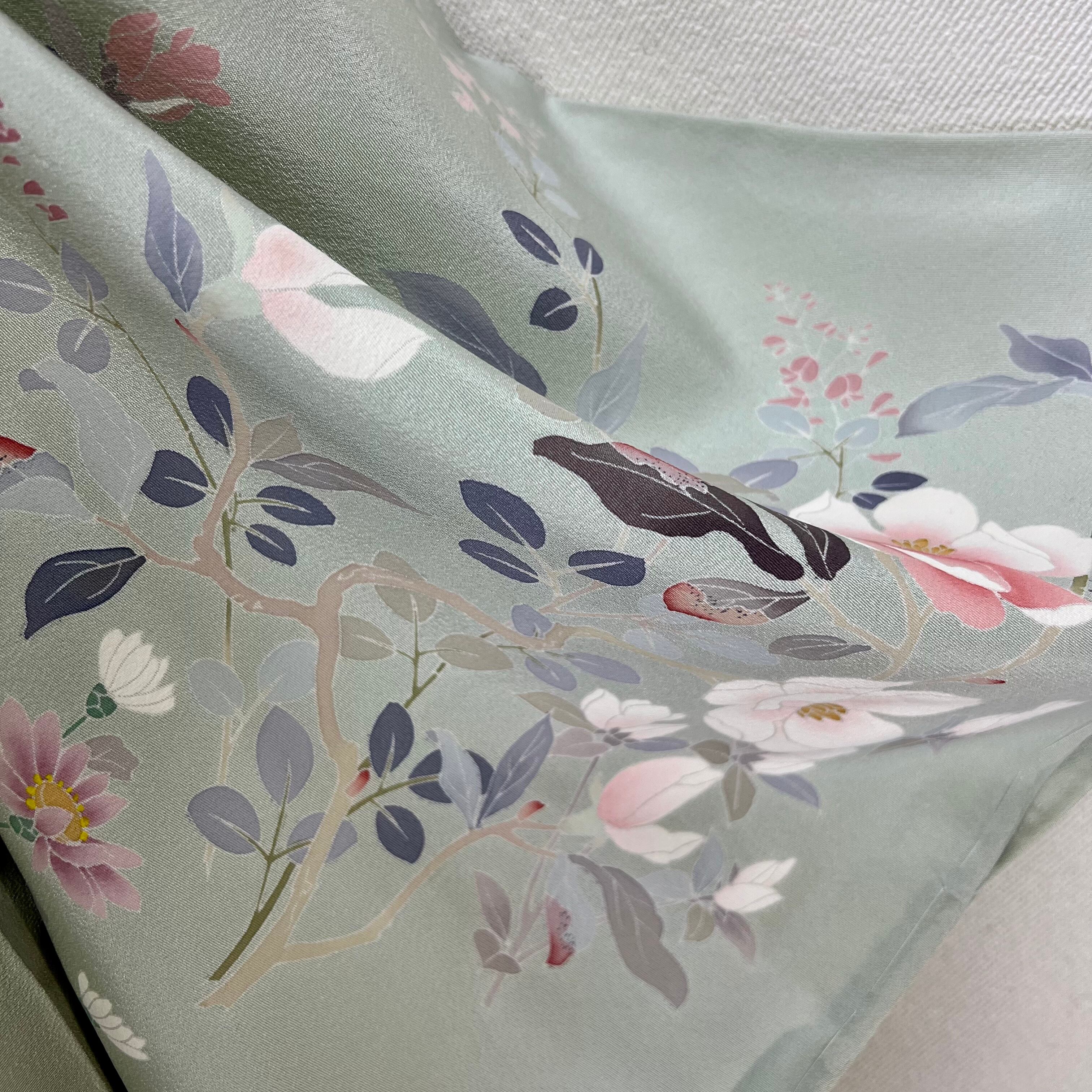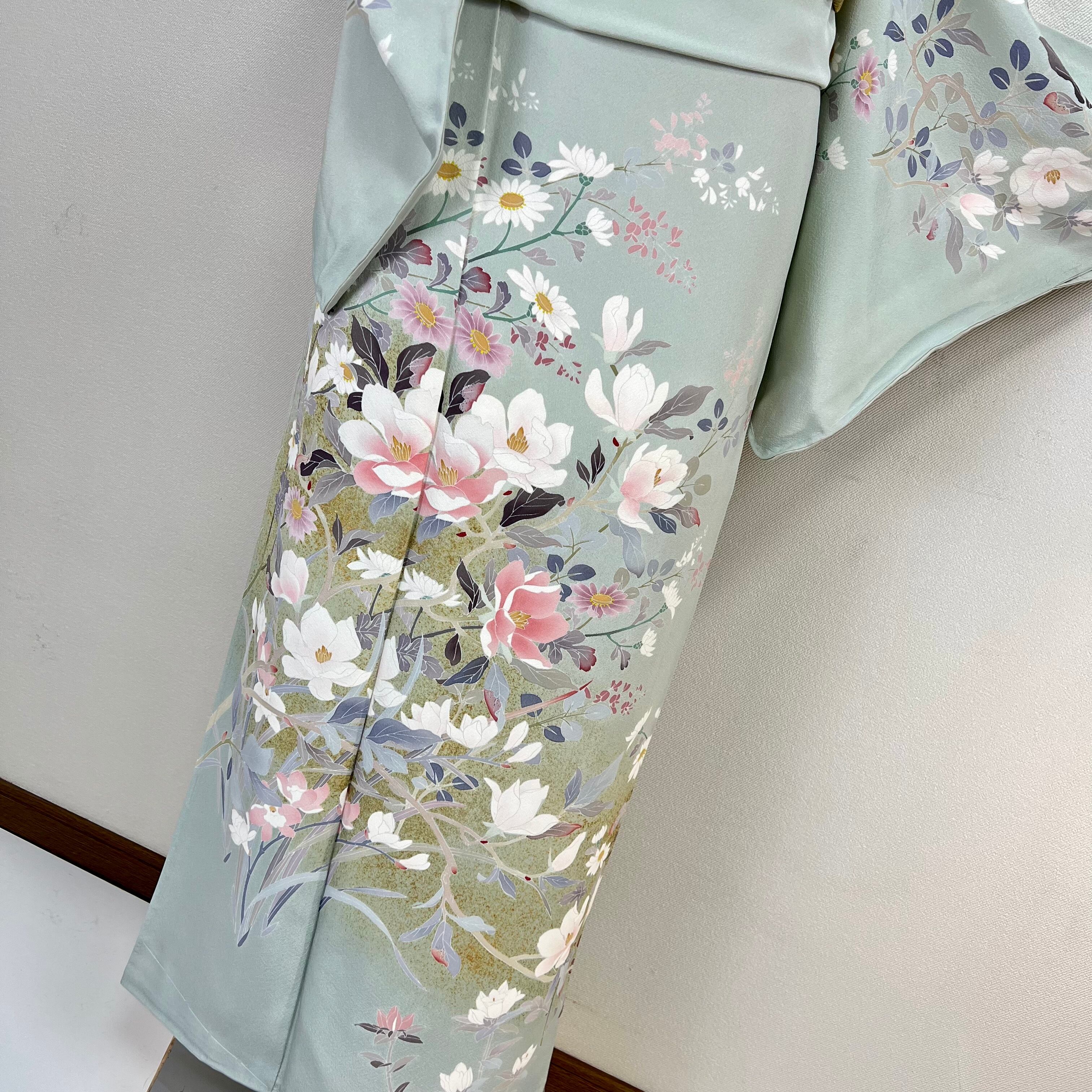 ◆淡いミントグリーンに四季の花々が丁寧に描かれ金彩があしらわれた京友禅美しい訪問着です。