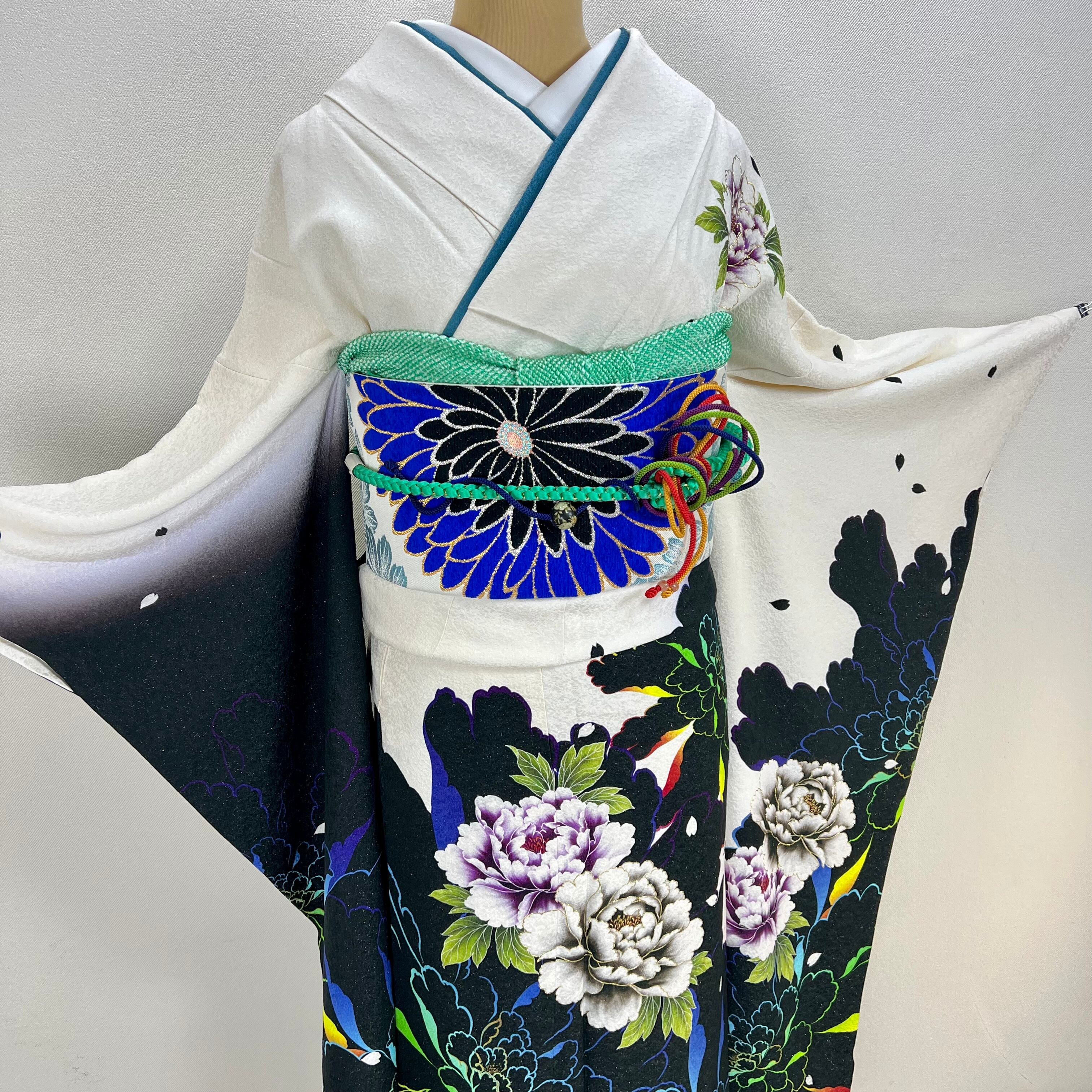 ◆銀通しの白×黒のモノトーン地に大輪の華が色彩鮮やかにあしらわれ金彩が施された大変豪華で華やかななお振袖に