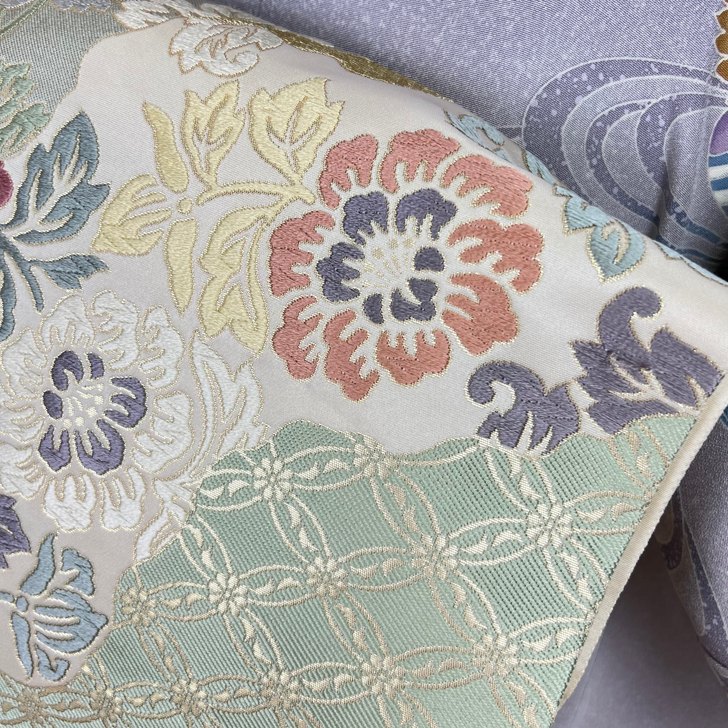 ◆道長取りに唐花、七宝つなぎ波文と織り上げられた唐織の大変美しい袋帯です。